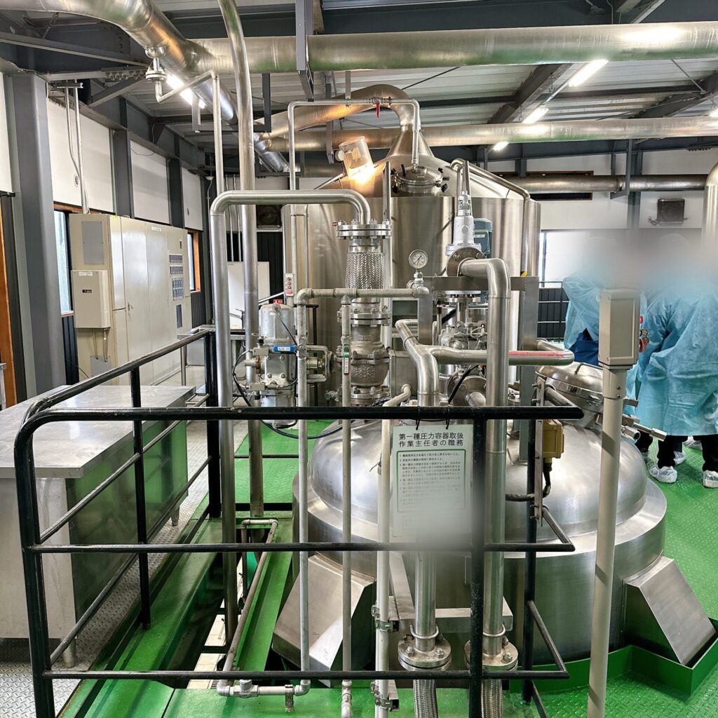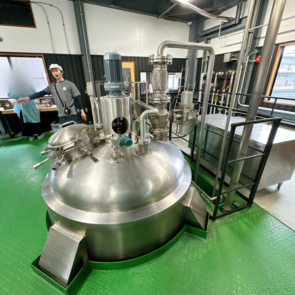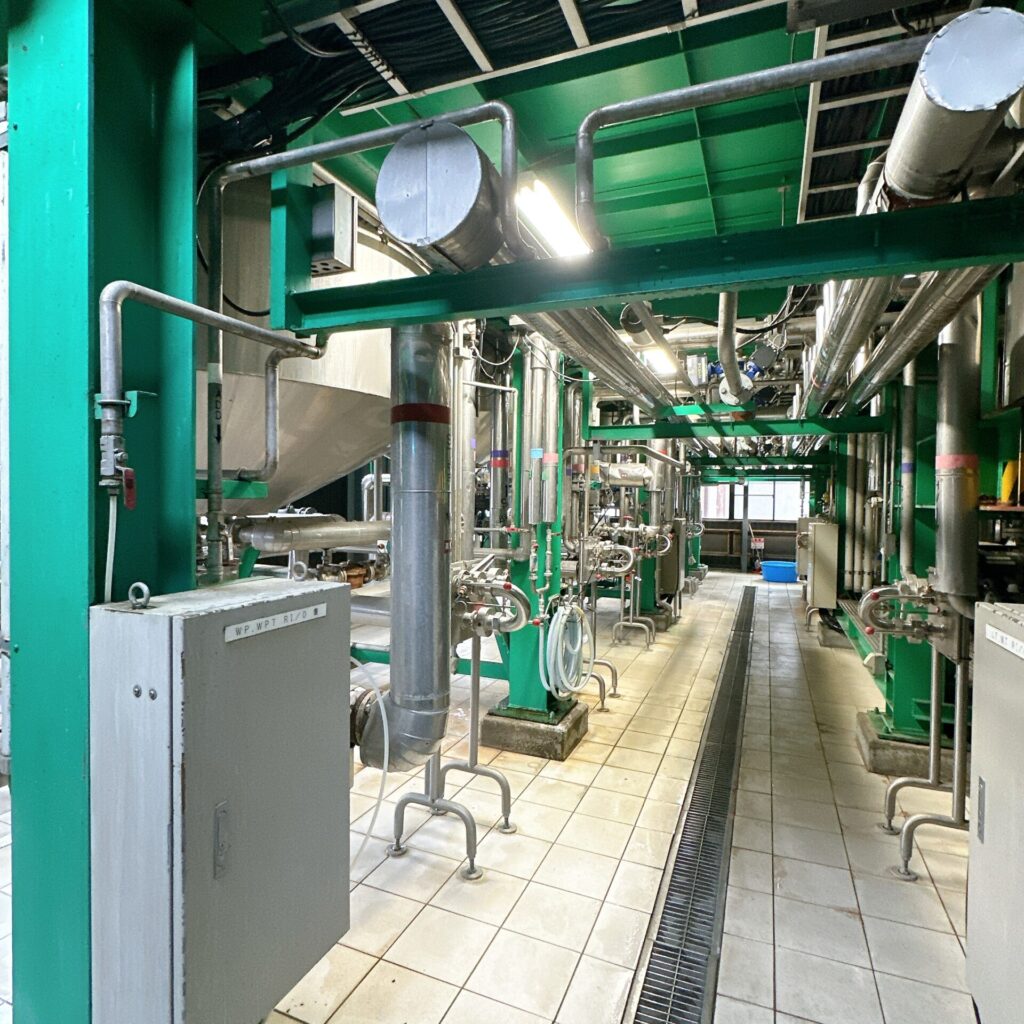 こちらは工場1階部分。発酵に関連する機械がずらりと並び、所狭しとのびる配管の、工場然とした美しさ! この無機の内側で有機を育てているんですよ……たまらん……