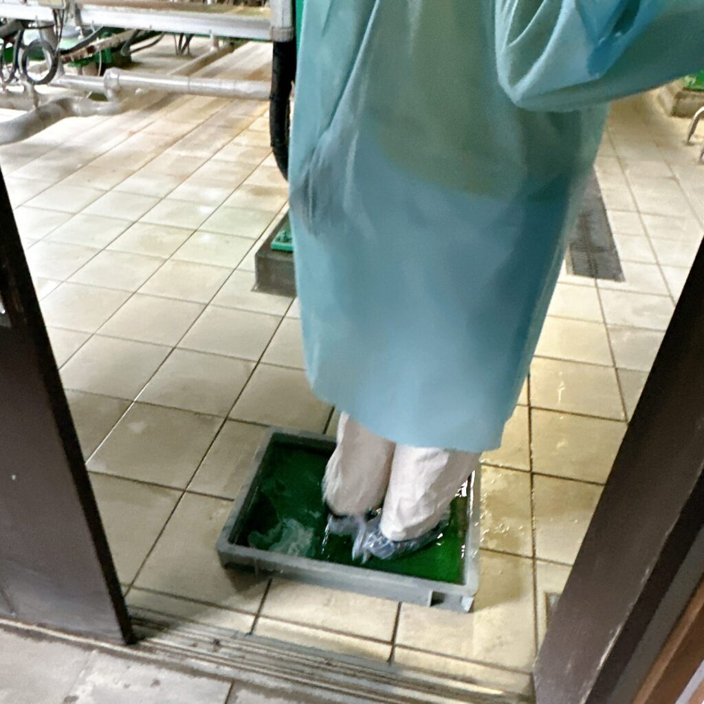 製造現場の工場へ入るには、衛生管理が必要不可欠。一般的な食品加工工場と同様に、不織布ヘアキャップと白衣を着用し、靴カバーをした上で、消毒液を通ります。