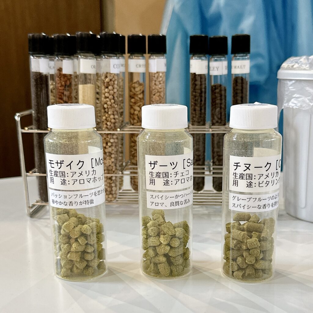 画像手前はビールの原材料といえば! の、ホップをパレット状にしたもの。それぞれに違った特徴を持っていて、香りも風味も面白いほど違います。