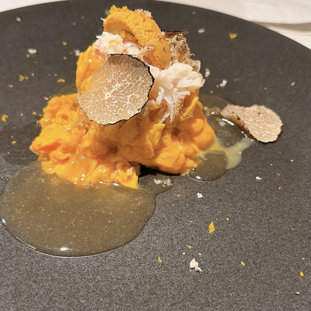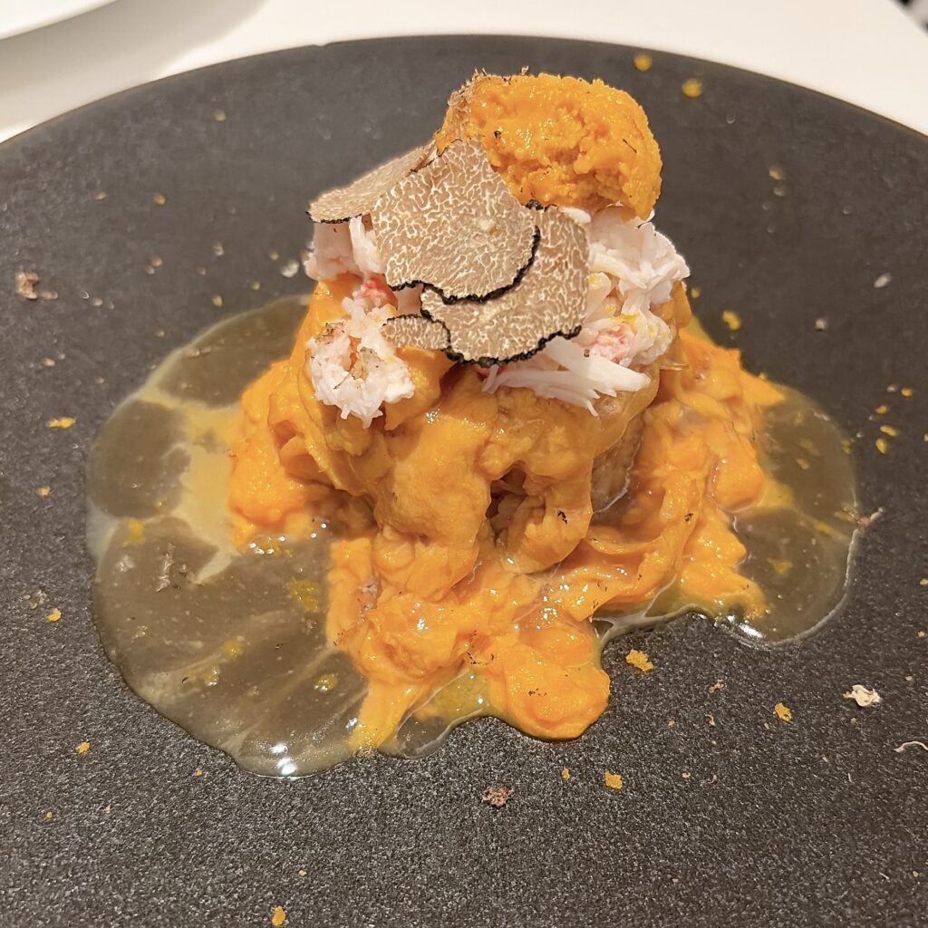 2品目は「間人ガニのオムライス」。このビジュの威力!! ほわっと立ち上るお出汁の香りは上品で、ビジュアルの強さと品を兼ね備えた、こういう人に私はなりたい……という感じのお料理です。