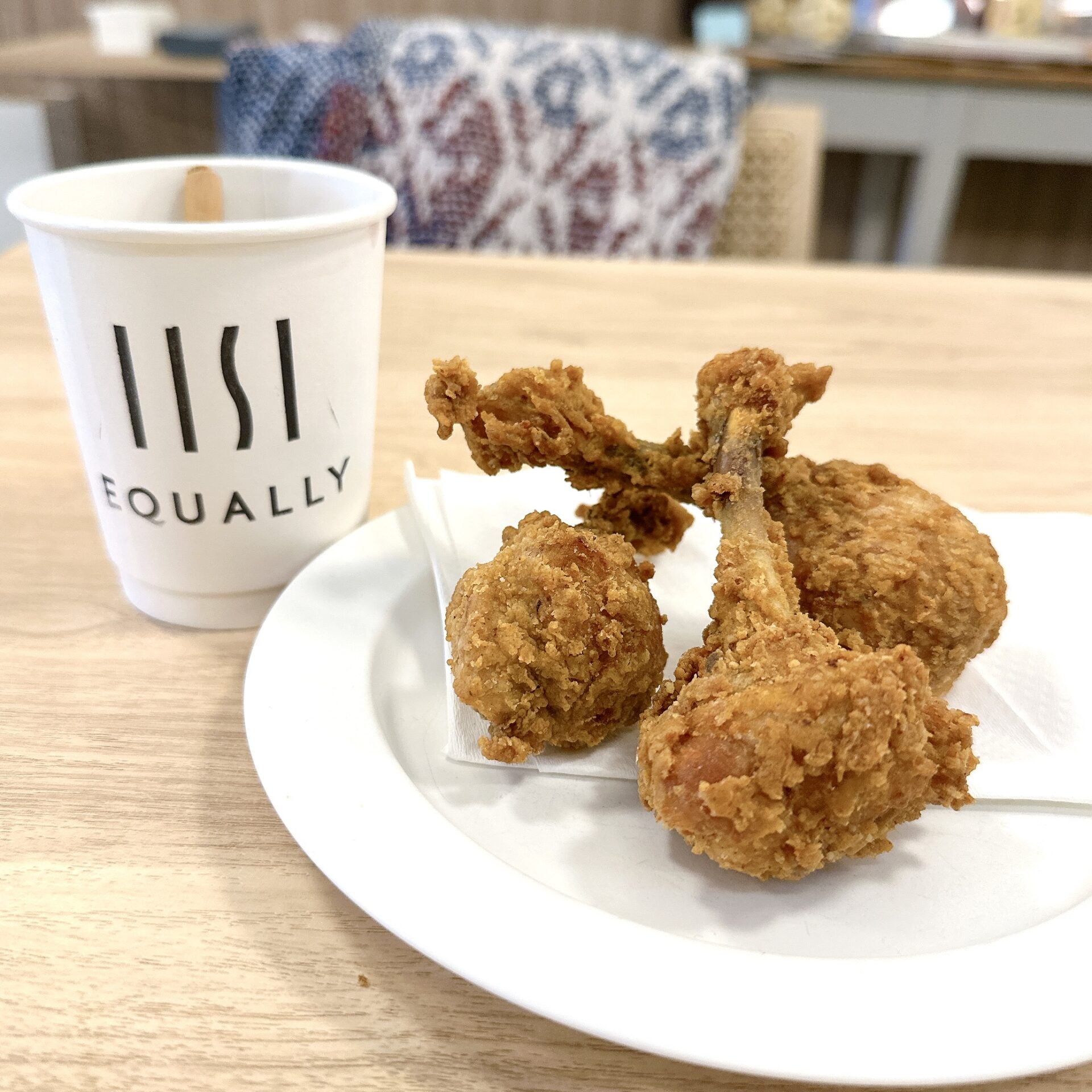 『骨付きフライドチキン』せひ食べてください。サクサク軽やかで優しくスパイスが香る衣。中のお肉は、じゅわっとふっくらやわらか。10種類以上のスパイスをオリジナルでブレンドして味付けしているのだそう。そりゃ美味しい。