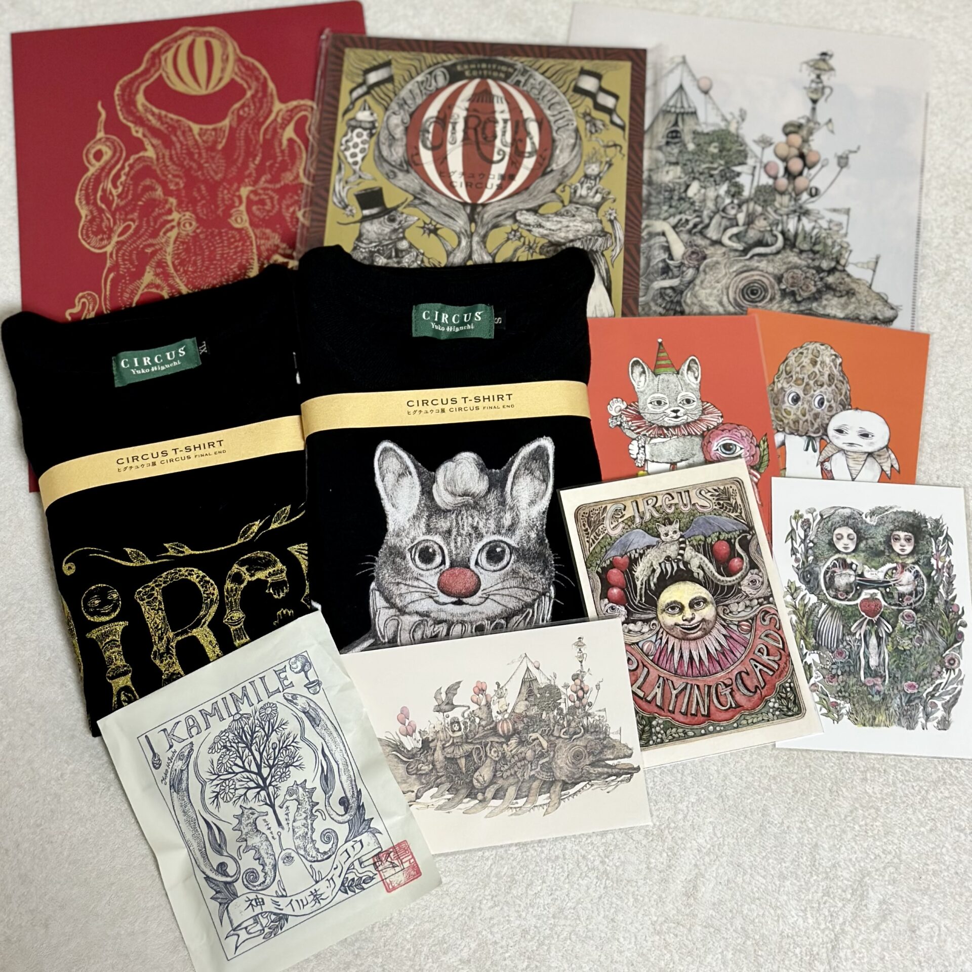 事前のグッズ情報と、実際の作品を見てからとで印象は変わるもので、特に切り紙絵作品はタイトルがわかると急激に解像度がアップ。「刀を飲む人」や「イカロス」などの切り紙絵デザインのTシャツやバッグは、鮮明に魅力を増したように感じました。
