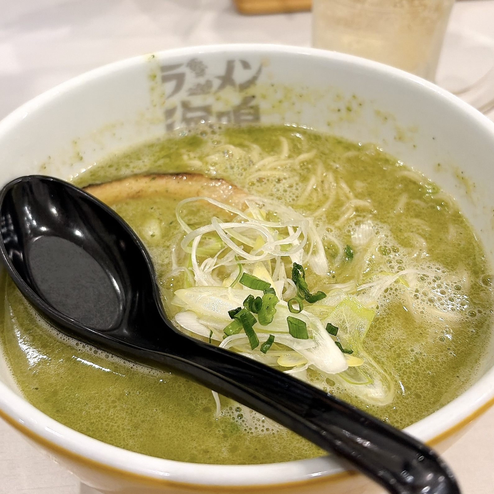 緑色のスープに、わかっていてもちょっと驚いてしまう「ラーメン ジェノバ」。その名のとおり、ジェノベーゼソースを合わせた洋風の1杯です。