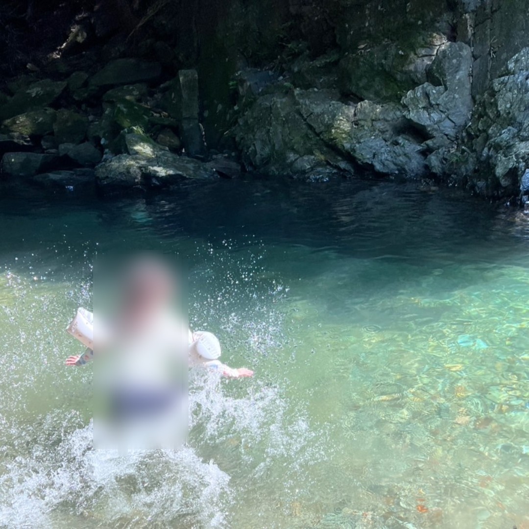 階段を背にして右に行くと、急流を経て大人の腰ほどの深みがあります。飛び込む子どもたちもいますが、川底には岩もたくさんあるので気をつけて飛び込んで!
