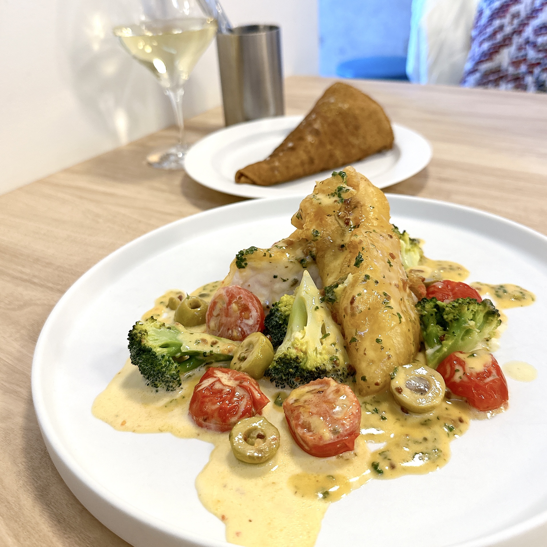 個人的には、ソースをたっぷりまとわせたトマトとお魚を一緒にいただくのがとても好みでした。お魚とトマトの美味しいが、レモンクリームソースのさわやかさとと共に押し寄せてきます。ので、飲まれるが吉です。