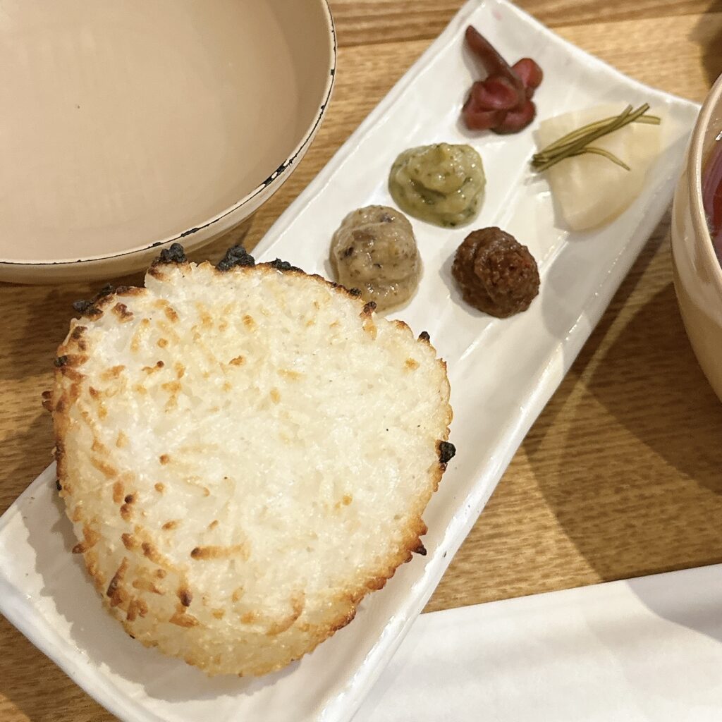 「具おみそ汁“は”セット」は、具だくさんのおみそ汁に、焼おむすびとおかず味噌3種つき。瓦煎餅のような甘いお煎餅もついてきました。