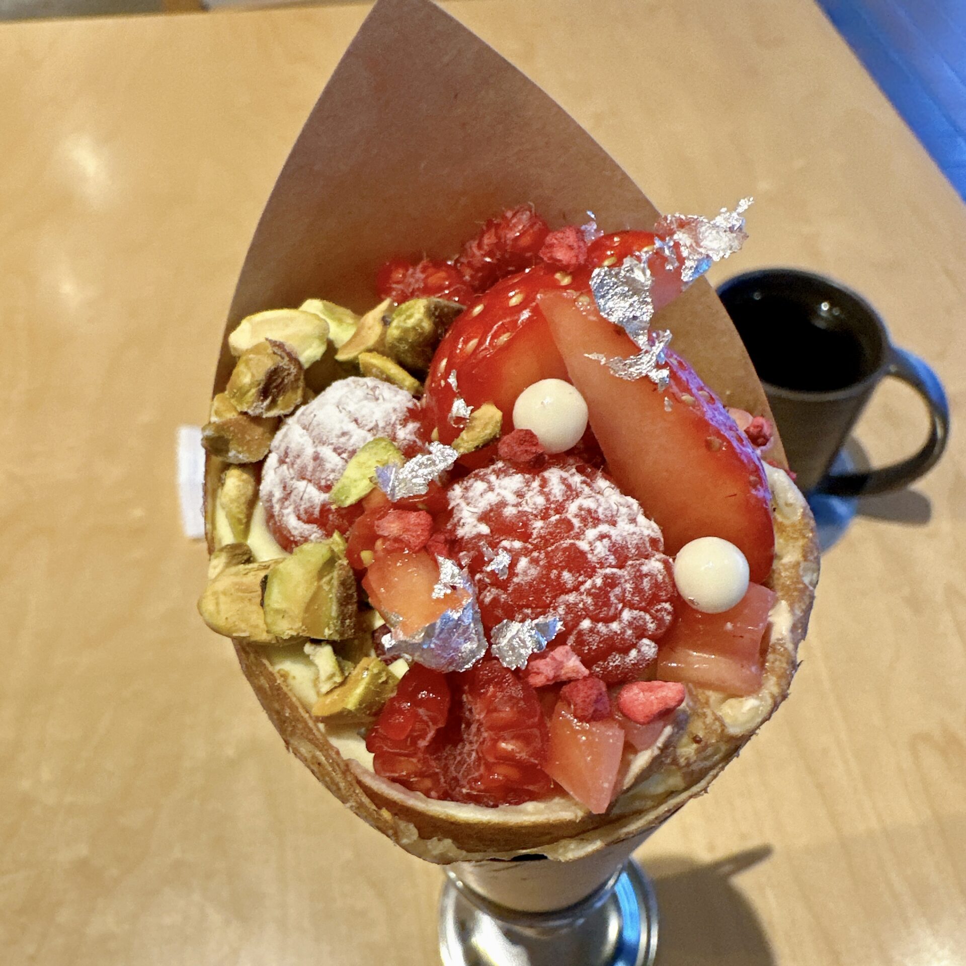 2023年12月の季節のクレープは、いちごとピスタチオが主役という点では近いものの、中のパーツにはかなり変化がありました。過去のクレープを思いながら今のクレープを楽しみ、次のクレープをワクワクしながら待つ。過去を知り、今後に期待しながら過ごす日々が、豊かな未来を作っていくように感じています。