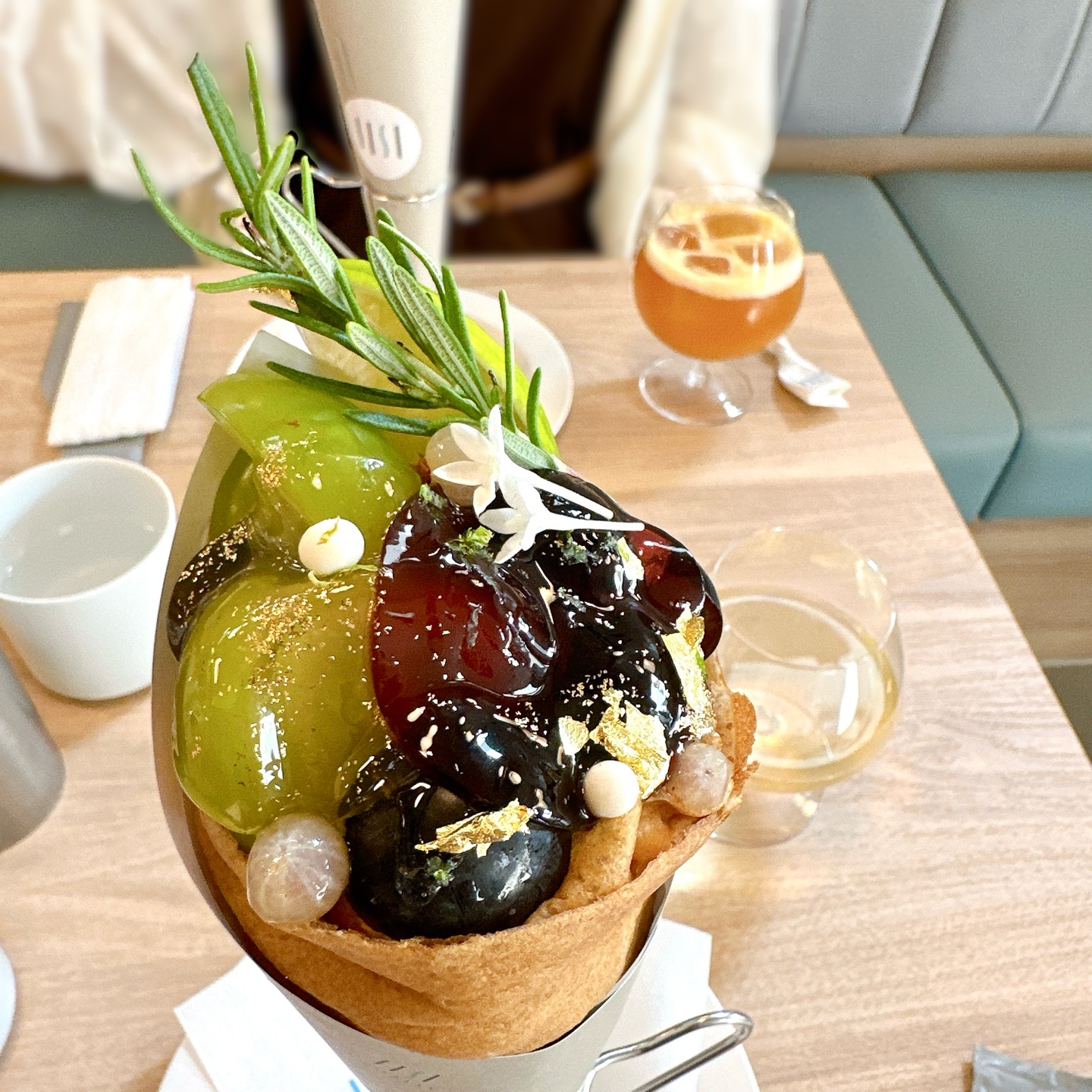 旬真っ盛りのシャインマスカットとナガノパープルを、あまりにも贅沢にどっさりといただける『クレープ・レザン×ミュスカ』。はじける果汁とともに溢れ出す多幸感を噛み締めに。ぜひ足を運んでみてください。