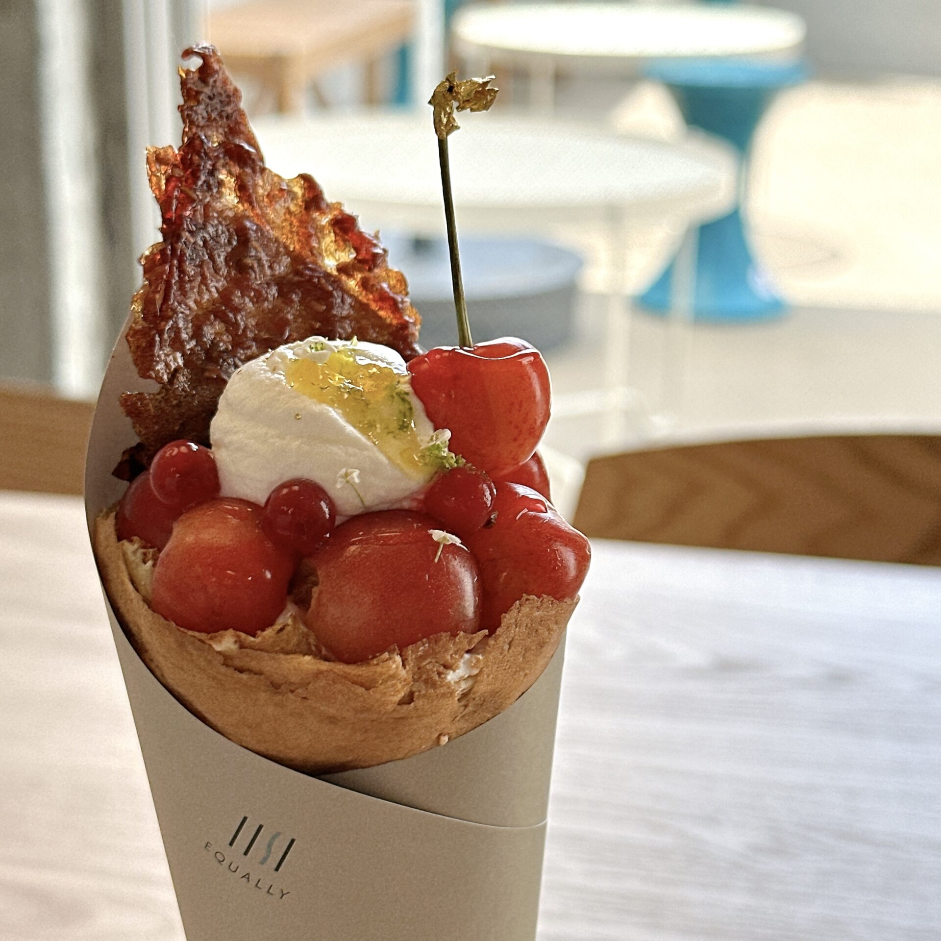 目が覚めるようにしっかりとコーヒーが香るのに優しい印象のコーヒーミルクチョコクランチや、すっきりさわやかなライムジュレ。さくらんぼを大葉とキルシュでマリネしたものは革命的なさわやかでいい香り! 合うんだ……おいしい。
