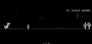 いきなり色が反転して驚きましたが、一定のスコアに到達すると「ナイトモード」に突入し、さらに一定のスコアを稼ぐと元の白背景に戻りました。一日中走り続けているという描写なのでしょうか。驚異的な体力をもつティラノサウルスさんに頭が下がります。