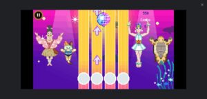 さっそく競技開始。鮮やかな衣装に身を包んだ選手たち(一部除く)が、華麗な演技を披露します。なぜ海中にミラーボールが設置されているのか、なぜ右端のカメさんだけ衣装を身にまとっていないのかという疑問を抱きつつ、リズムに合わせて矢印キーを押していきます。
