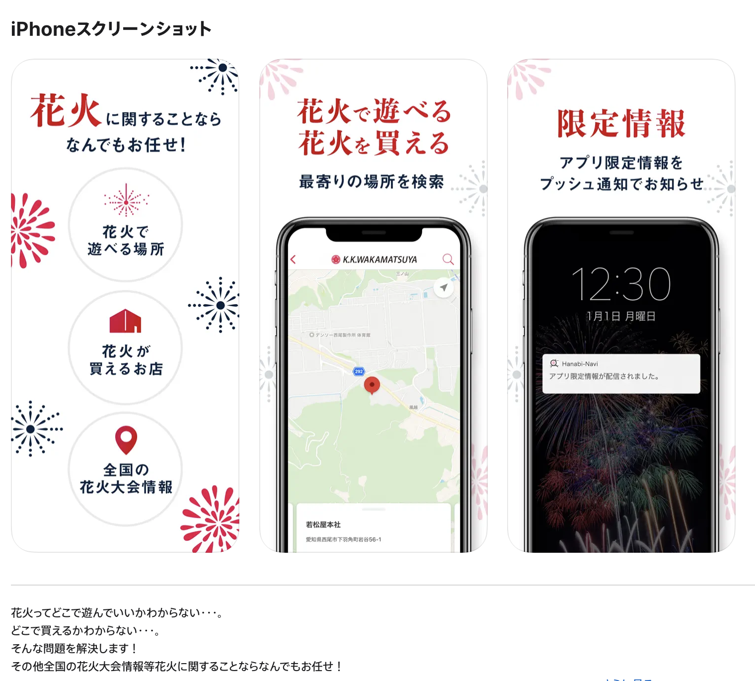 『Hanabi-Navi』は、花火を楽しむにあたって多く聞かれる悩みを解決することを目的としたアプリ。花火で遊ぶための場所探しや花火を購入する店舗検索はもちろん、花火で遊ぶときの注意点も同時に知ることができます。