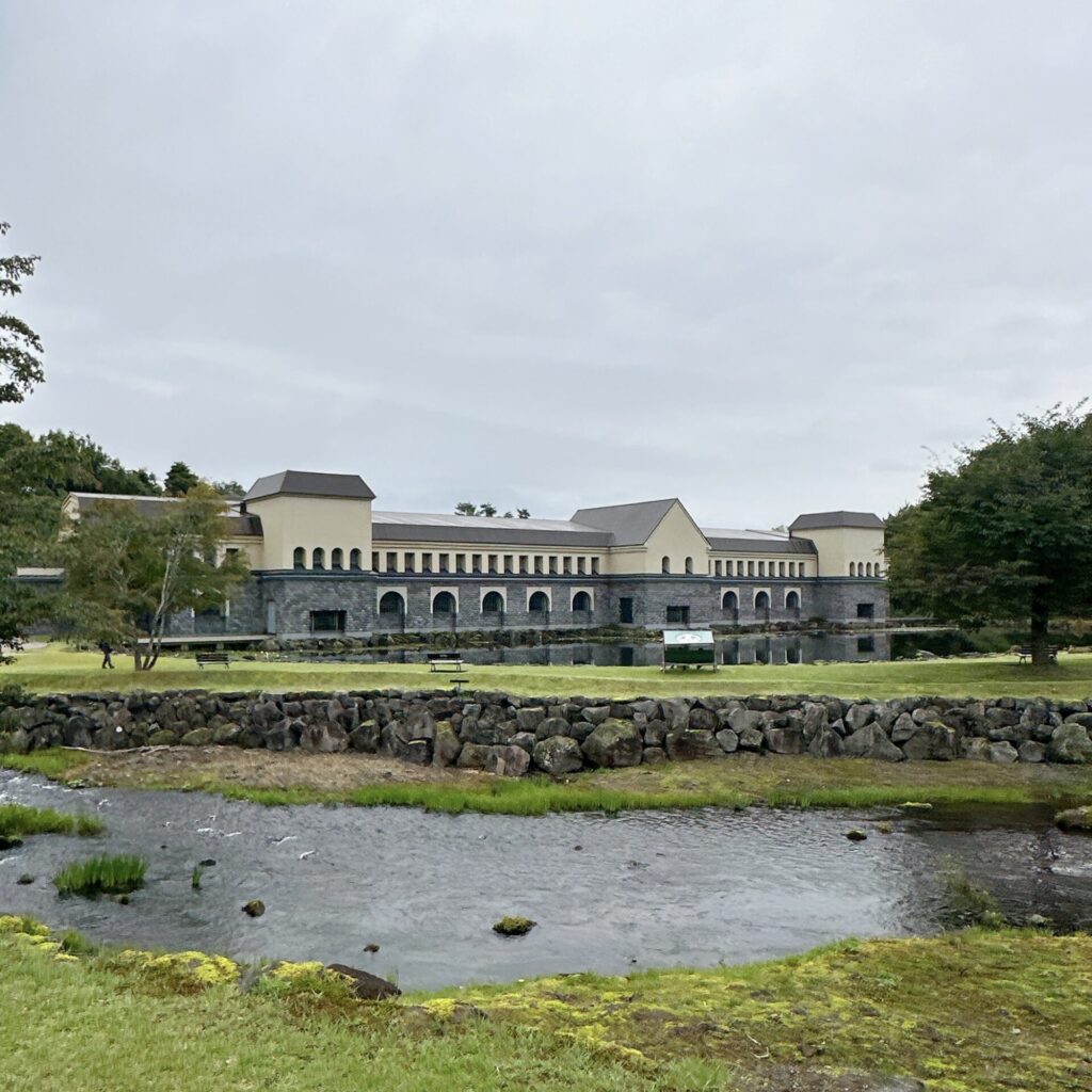 敷地内に入ると、川のせせらぐ音が心地よく、視界が開けるとシンプルで美しい建物が。曇天も静謐で美しいですが、晴れた日の爽快な美しさもぜひ見てほしいんですよね。どっしりと構える建物と、木々の緑と空の青のコントラスト! なんて贅沢なんでしょう!