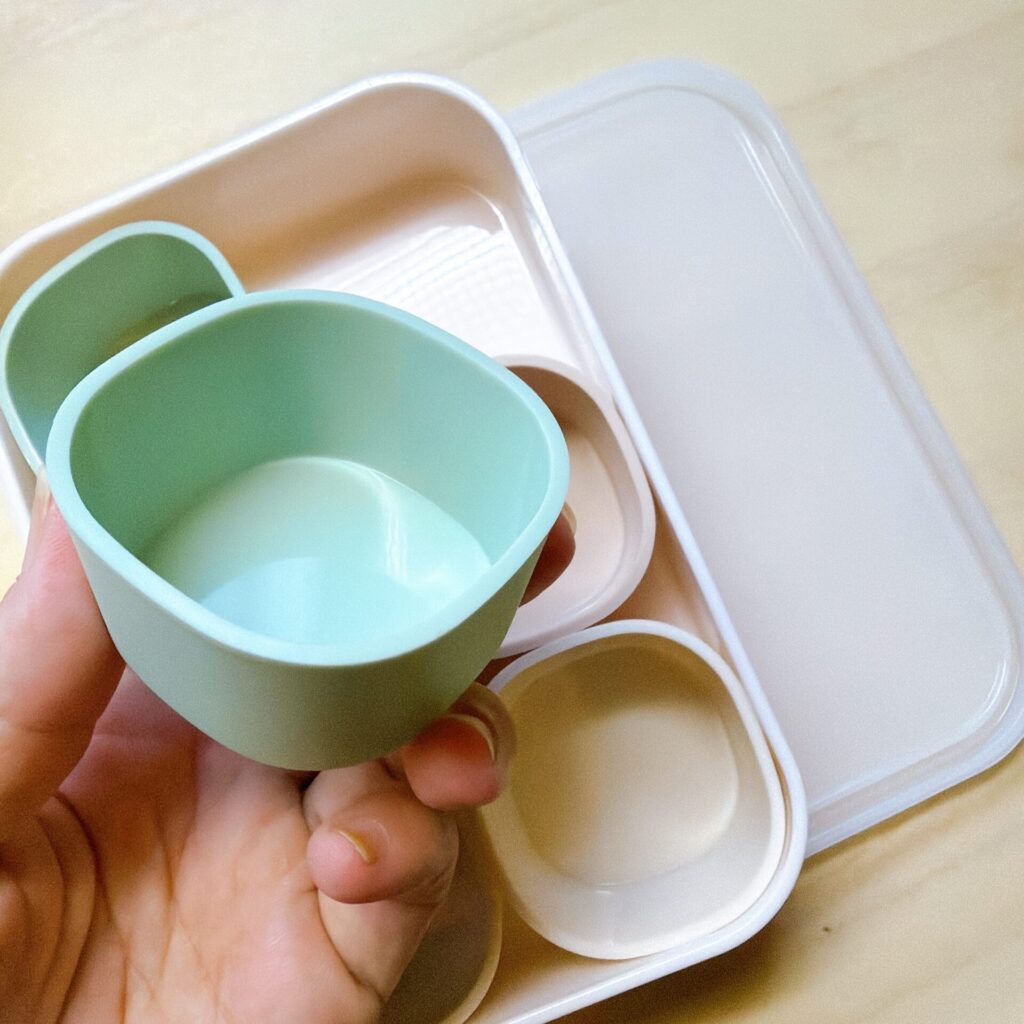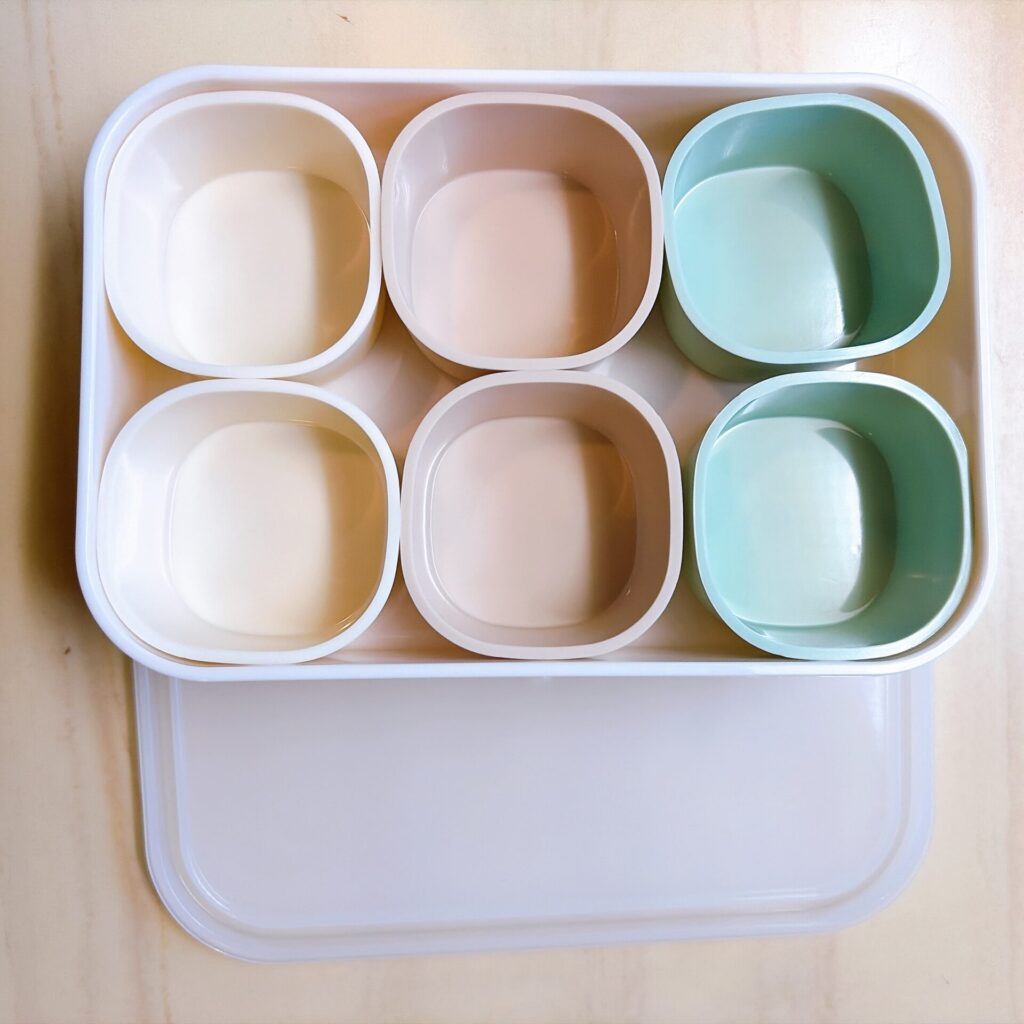 小さなカップが6個セットになったノーマルサイズです。ちょっとしたおかずを小分けにしておくのに便利ですね。柔らかい色味も使いやすそう。