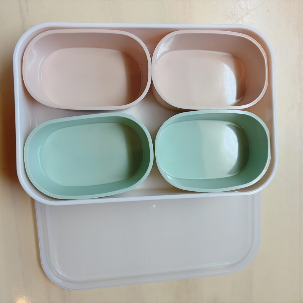 こちらは少し大きめの楕円形が4つセットになったものです。炒め物や煮物、主食系を詰めるのに向いていそうです。