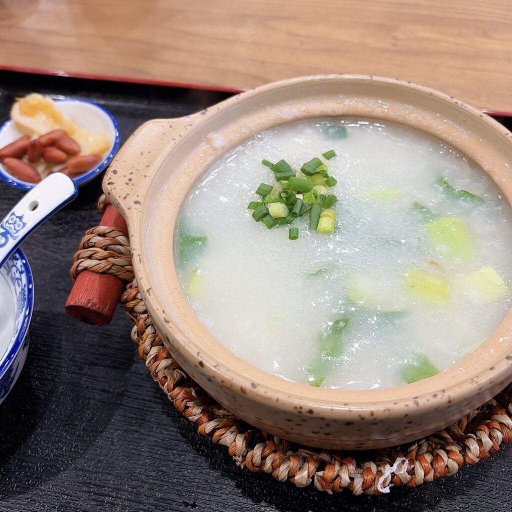 土鍋で提供されるアツアツの、帆立と季節野菜のお粥を、現地さながらの雰囲気と共に味わってきました。