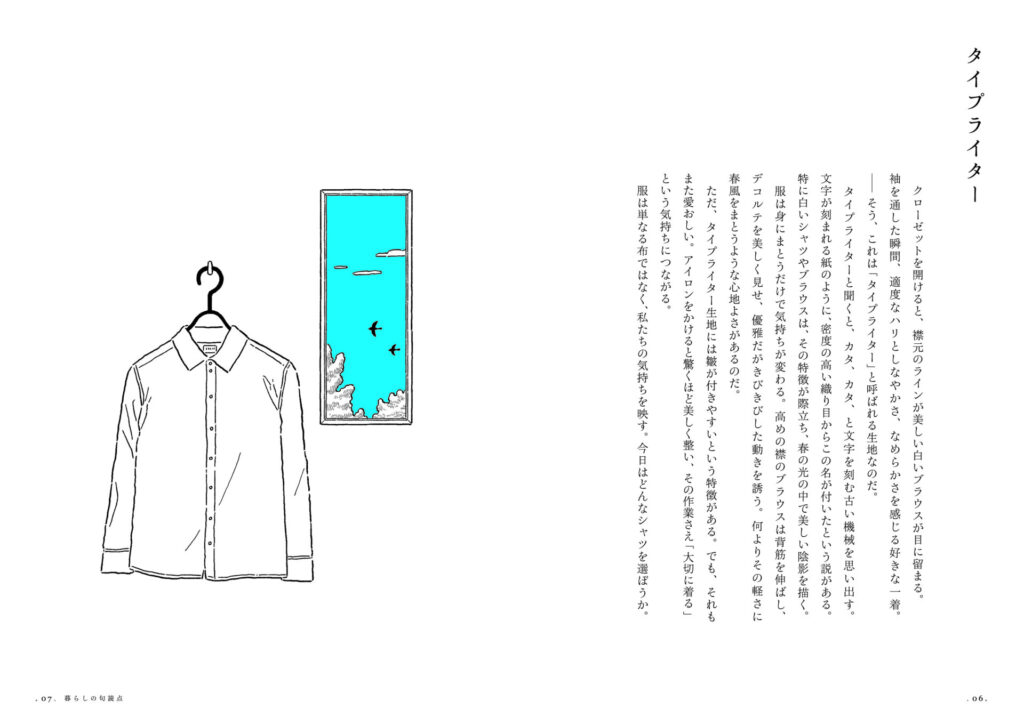 本書のエッセイには、そんな「間」を通じて衣類とのささやかな関わりや、わくわく感、安らぎ、不安といった感情が穏やかに綴られています。