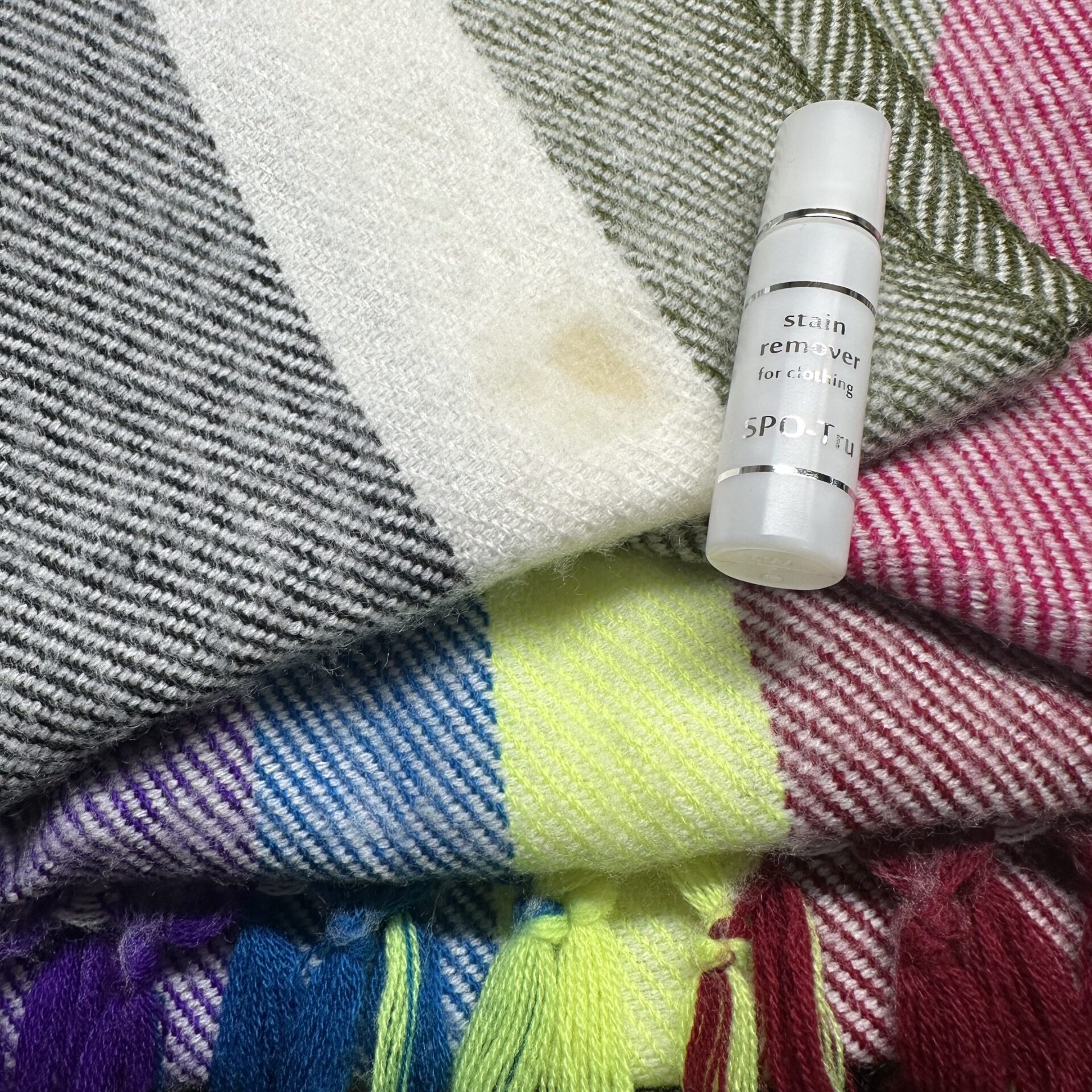 今回『スポッとる!』でシミ抜きをするのは、昨年の春先にコーヒーをこぼしたことをすっかり失念してそのまま洗濯しただけのストールです。