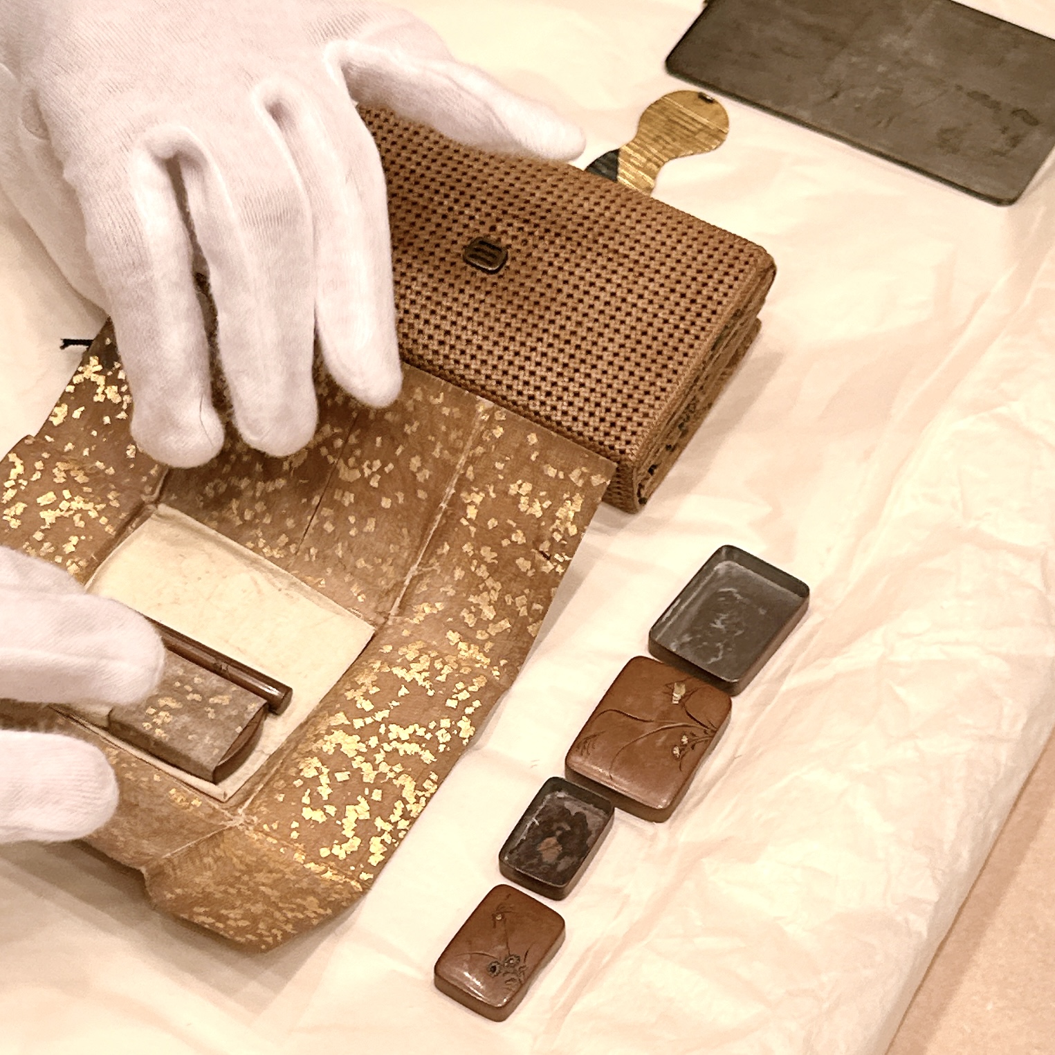 この鏡入れの大きさは、学芸員さんの手と比較するとわかりやすいですが、小型の三つ折りのお財布くらいでしょうか。意外とたくさん入るものですね。