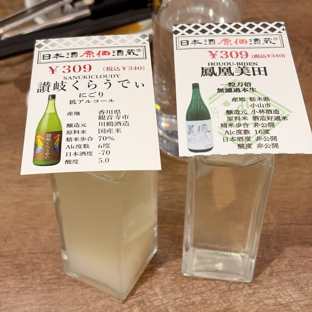 飲み放題でたくさん飲むと、何を飲んだかわからなくなってしまいがち。でも、日本酒原価酒蔵では、注文した銘柄のカードをつけてくださいます。