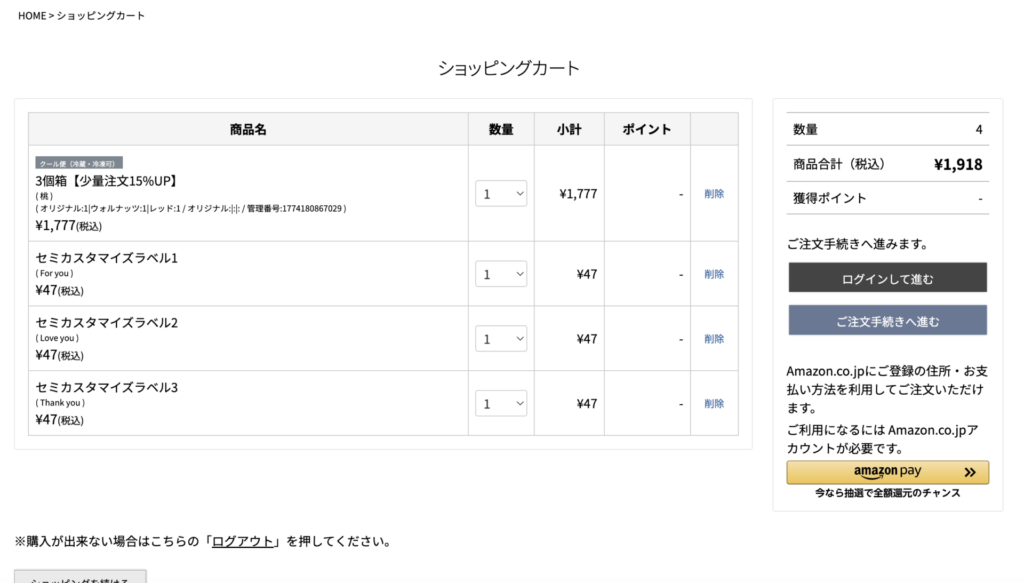 カート画面に遷移すると、税込価格が表示されます。注文内容を確認して注文手続きへ。Amazon payが使えるの、便利で嬉しいですね。