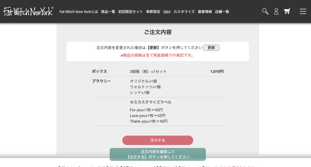必要事項を入力して、「注文内容確認」を押すと、選んだ項目と金額が表示されます。間違いなければ、「注文する」を押して進みましょう。