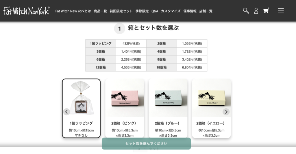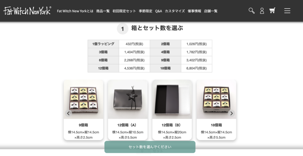 まず選択するのは箱とセット数。1個ラッピングから18個箱まで、用途に合った入り数の箱を選びます。